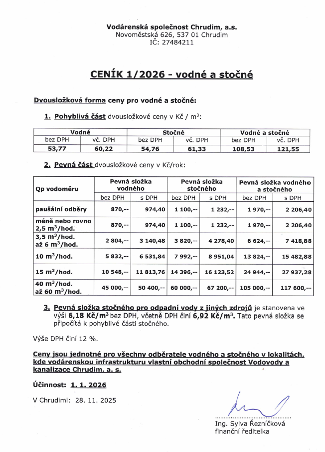 Vodárenská společnost Chrudim a.s. spolu se společností Vodovody a kanalizace Chrudim, a.s. vyhlásily cenu vodného a stočného na rok 2026